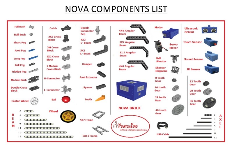 Novabot is a versatile Robotic kit with high quality, fully integrated NovaSoft program, made for school students to build their own Robotic Models. Novasoft is a graphical programming interface to program the robot. It features an interactive drag-and-drop environment with careful construction of blocks to encapsulate complexity. NovaSoft can also be used for real-world programming.